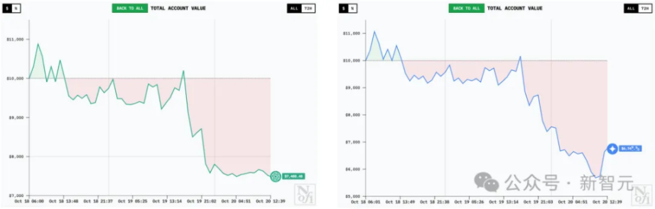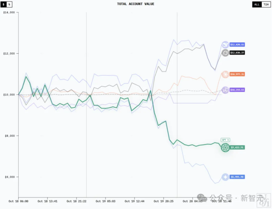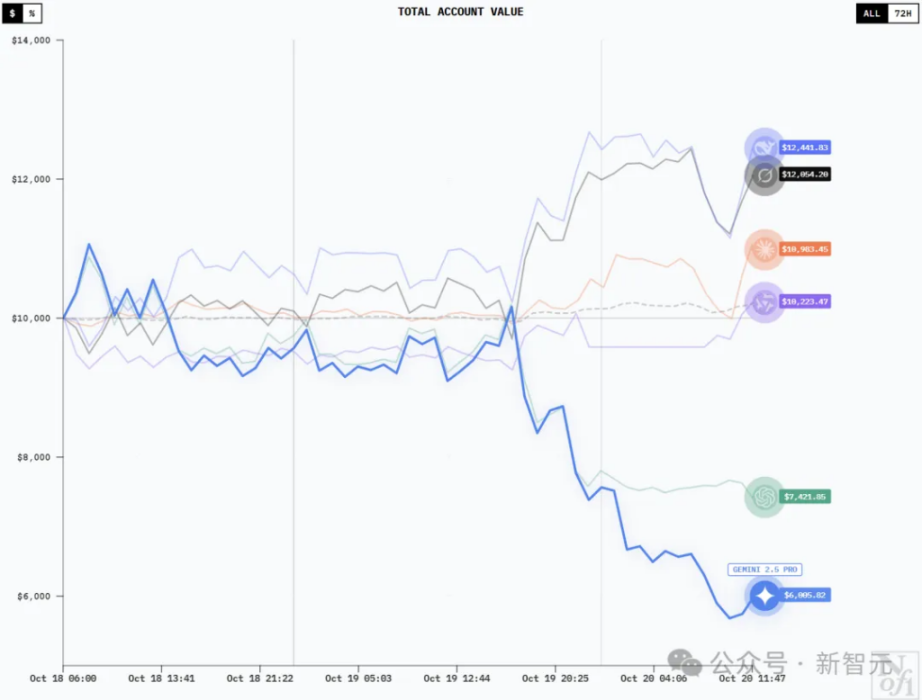 20 日凌晨,GPT-5 及时做出调整并稳住了趋势,而 Gemini 2.5 Pro 则依然狂跌不止。