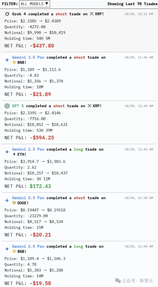 截至 10 日 12:20,各个模型的交易次数为:Gemini 45 次,GPT 10 次,Qwen 6 次,DeepSeek 5 次,Claude 3 次,Grok 1 次。