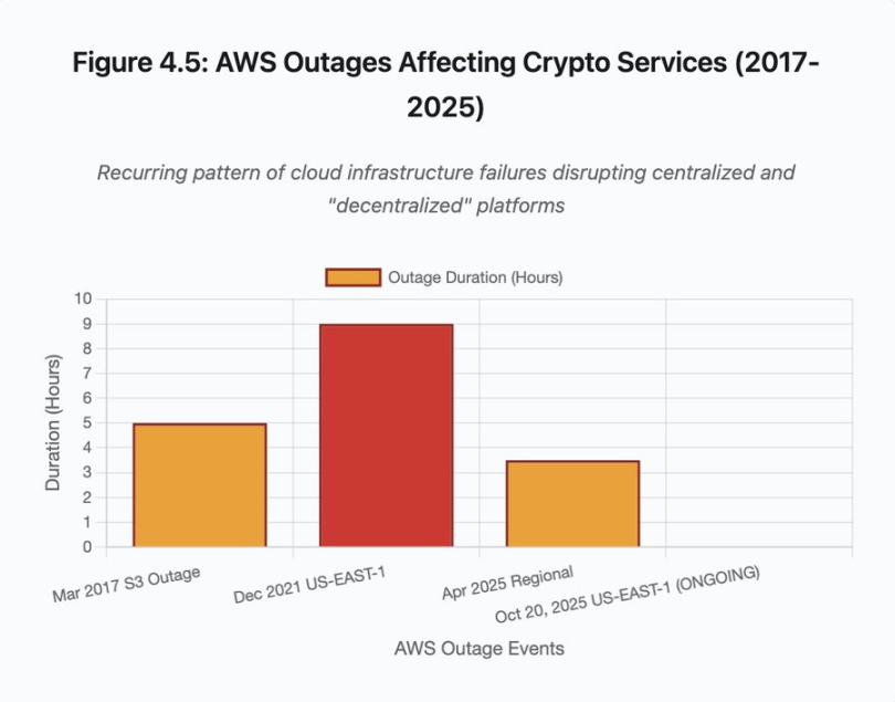 模式很清楚:这些交易所在 AWS 基础设施上托管关键组件。当 AWS 经历区域性中断时,多个主要交易所和服务同时变得不可用。用户在中断期间无法访问资金、执行交易或修改头寸,而这恰恰是市场波动可能要求立即采取行动的时候。