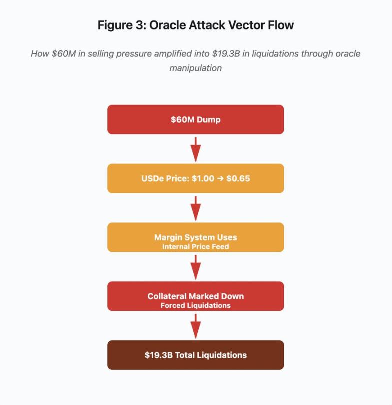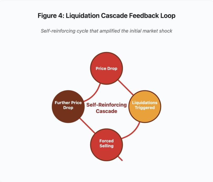 这些清算迫使更多卖单进入同一非流动性市场,进一步压低价格。保证金系统观察到这些更低的价格,并标记了更多头寸的价值,反馈回路将 6000 万美元的抛售压力放大成了 193 亿美元的强制清算。
