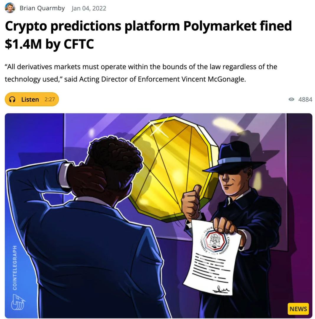 Polymarket 自 2020 年 6 月上线后快速增长,但 2022 年 1 月收到 CFTC 严厉处罚:因未注册为交易所,需支付 140 万美元罚款,并禁止向美国用户提供服务。此后两年,Polymarket 仅对非美国地区开放。