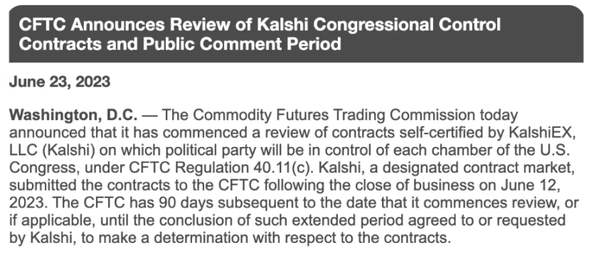 但在 2023 年 6 月,Kalshi 自行认证并推出「国会控制权」相关市场后,CFTC 提出异议,认为此类市场属于对赛事下注,违反州级法律,且不符合公共利益。Kalshi 于同年 11 月向联邦法院提起诉讼,并在 2024 年 9 月胜诉;CFTC 撤回上诉后,Kalshi 彻底摆脱了这一监管障碍。