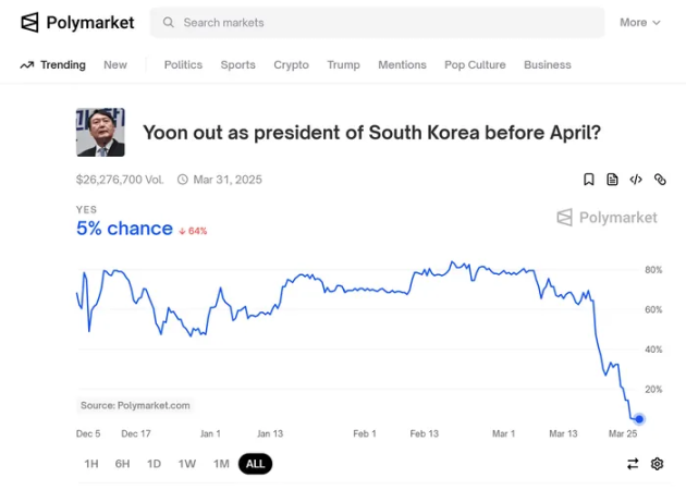 2025 年初前总统尹锡悦弹劾危机期间,Polymarket 上出现大量韩国政治事件相关合约,引发韩国公众与媒体对预测市场的广泛关注。韩国媒体一致将 Polymarket 定义为非法私营 Toto,并强调根据韩国现行法律,韩国公民参与预测市场下注,可能被视为赌博罪加以处罚。