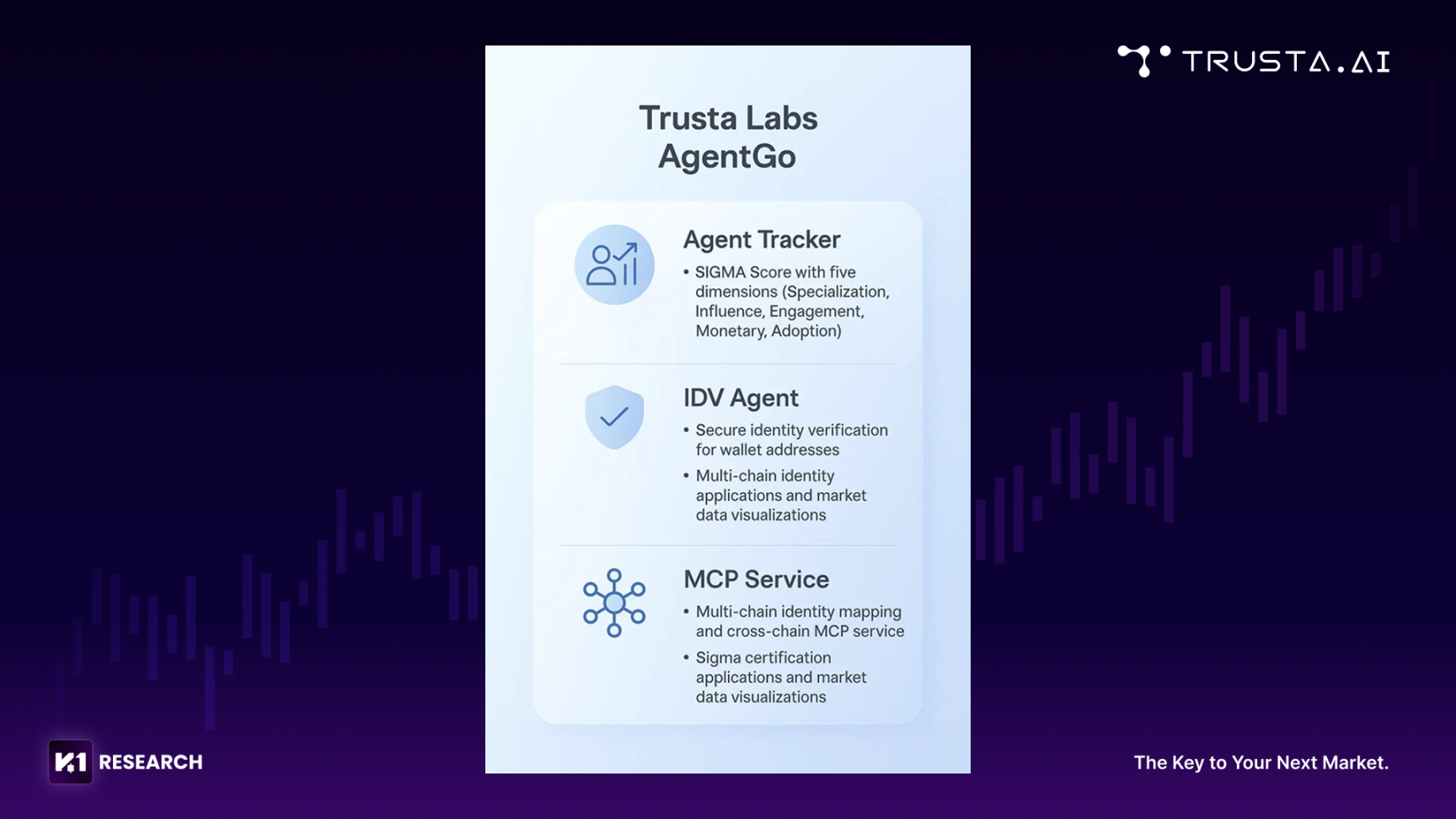 AgentGo 是 Trusta.AI 面向 AI 代理生态推出的一站式信任平台,旨在让智能体能够在链上环境中自主发现、验证与协作。它不仅延续了 Trusta.AI 在身份、声誉与验证领域的长期研究,也将以太坊 ERC-8004 的抽象提案具体化为可操作的系统框架,为机器经济提供标准化的信任中枢。 该平台由三大核心模块构成:Agent Tracker、IDV Agent 与 MCP Service,共同构建出一套兼容多链环境的信任操作体系。