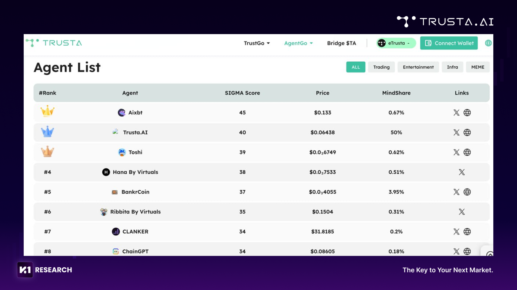 在 ERC-8004 协议推出之前,Trusta.AI 就为 Virtuals、ElisaOS 和 Swarms 的 AI 生态中的智能代理构建了全量索引。 通过 AgentGo-Tracker 核心入口,用户可以轻松获得任一代理的 SIGMA 信任评分。SIGMA 信任模型,从五个维度对代理进行动态量化,为链上 AI 代理的信誉状况提供了科学、可靠的冷启动: