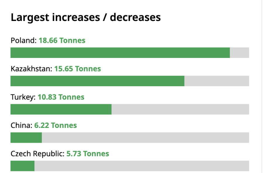 根据世界黄金协会公布的 2025 年 Q2 数据,波兰一口气增持 18.66 吨,哈萨克斯坦紧追其后,增持 15.65 吨,中国央行稳扎稳打,增持 6.22 吨……