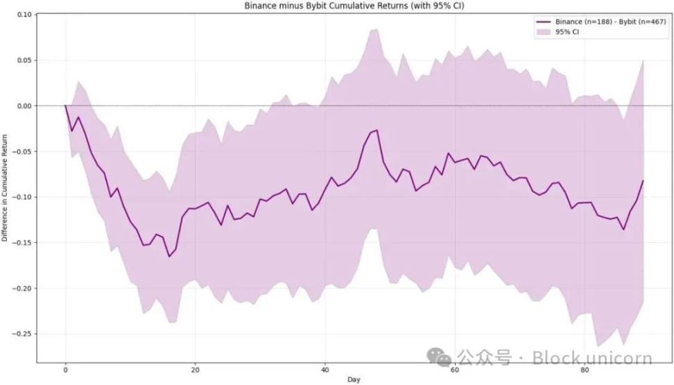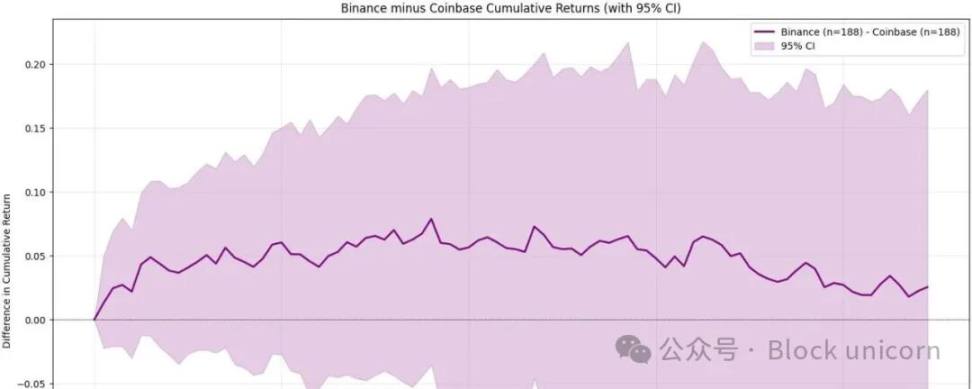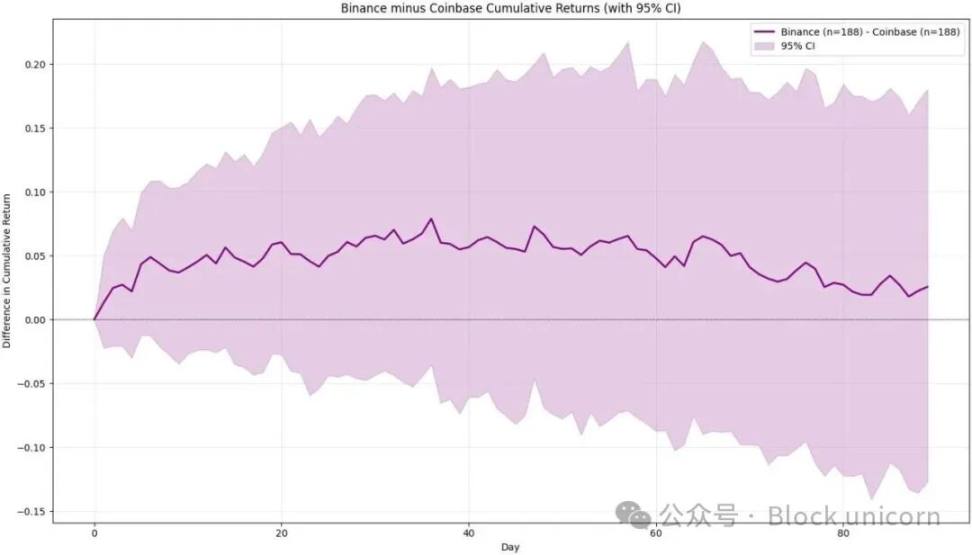 你可以清楚地看到——尤其是在 Coinbase 的例子中——币安的影响是正面的,而不是负面的。Coinbase 上的抛售压力远大于币安。当然,一旦考虑到置信区间,这种差异在 95% 的置信水平上不具有统计学意义——但结论仍然相当明确:币安上币的表现优于 Coinbase 上币。