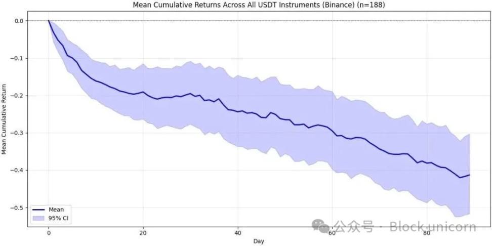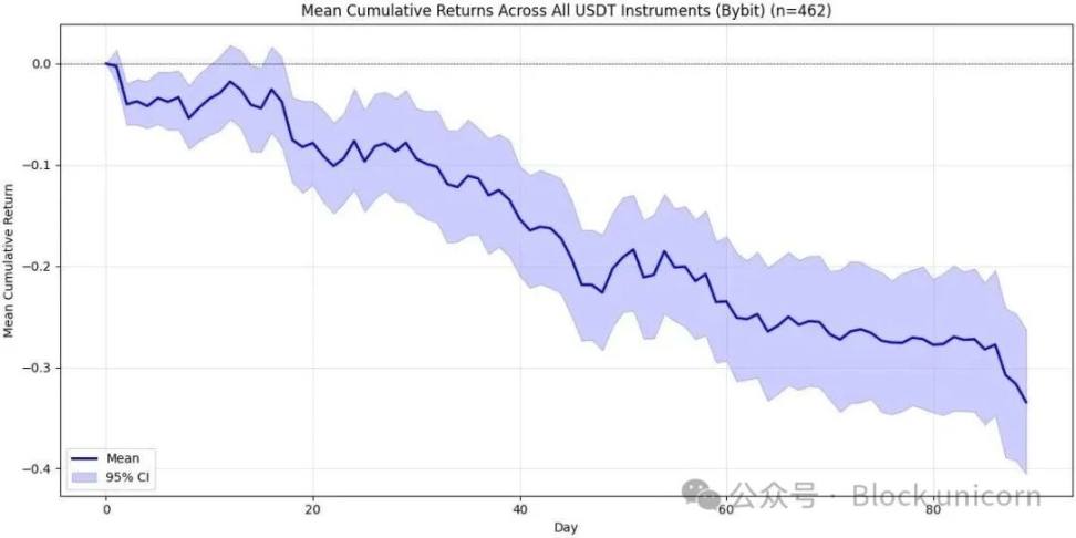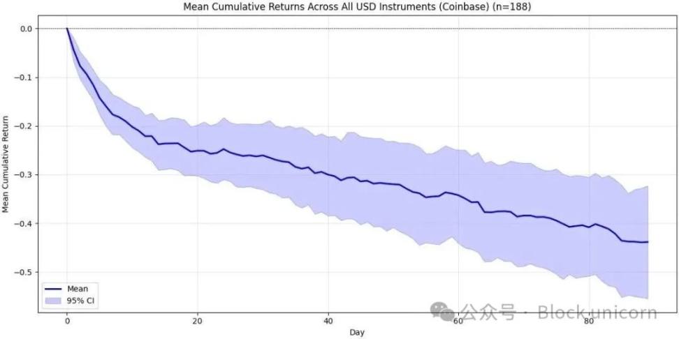 正如你所看到的,Coinbase 的图表看起来比币安的要糟糕得多。上线约 20 天后,预期回报率降至约 -25%(而且上置信区间仍在 -20% 左右!)。此后,我们再次看到了同样的模式——短暂的稳定后是一个缓慢的下跌趋势,就像在币安上一样。