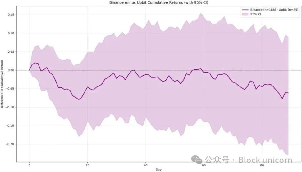 我们无法直接回答这个问题——目前没有清晰的数据。但你至少应该在心中有一个估算,思考一下其中的逻辑,然后给出一个数字。我之前提到过,Upbit 也是一家「终极目标」交易所,人们喜欢在韩国上市。不幸的是,我们仍然看到上市日后强劲的抛售压力。对于项目来说,这几乎总是一个终局——可能不如币安那么严重,但仍然显著——你可以在数据中清楚地看到这一点。下图显示了 Upbit 的表现以及币安和 Upbit 之间的差异。