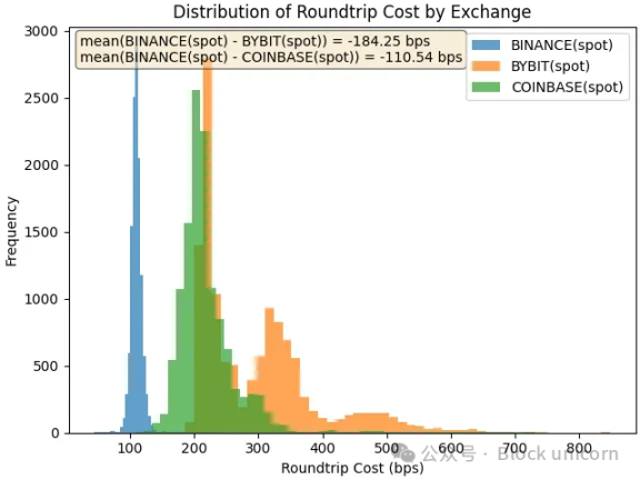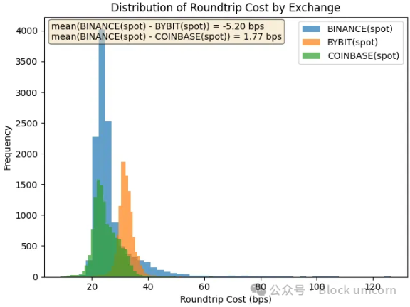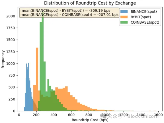 该图显示了往返成本的分布,即执行 10 万美元市场买入和 10 万美元市场卖出的成本。成本越高,流动性越低。对于在 Bybit 和 Coinbase 上线一个多月后才在币安上线的代币 LA 来说,我们发现,五天后,币安上的往返成本比 Bybit 低 184 个基点,比 Coinbase 低 110 个基点。
