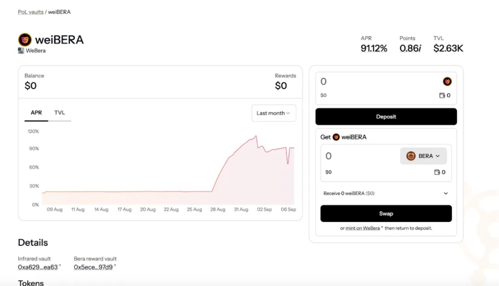 当然,我们同样可以将 iBERA 兑换为 weiBERA,并且将 weiBERA 在该页面进一步质押获得 90%+ 的 APR,并获得 Infared 积分(目前看其积分权重不高仅为 0.86),该方式目前看没有 iBERA/mBGT 的方案划算。