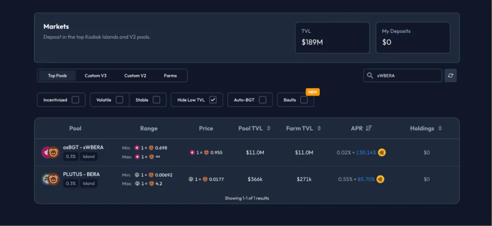 比如在 kodiak 上有 osBGT/sWBERA LP 池,并且整体的 APR 在 129%(这其中包括了交易手续费分配、Farming 以及治理代币 BGT 的综合激励)。