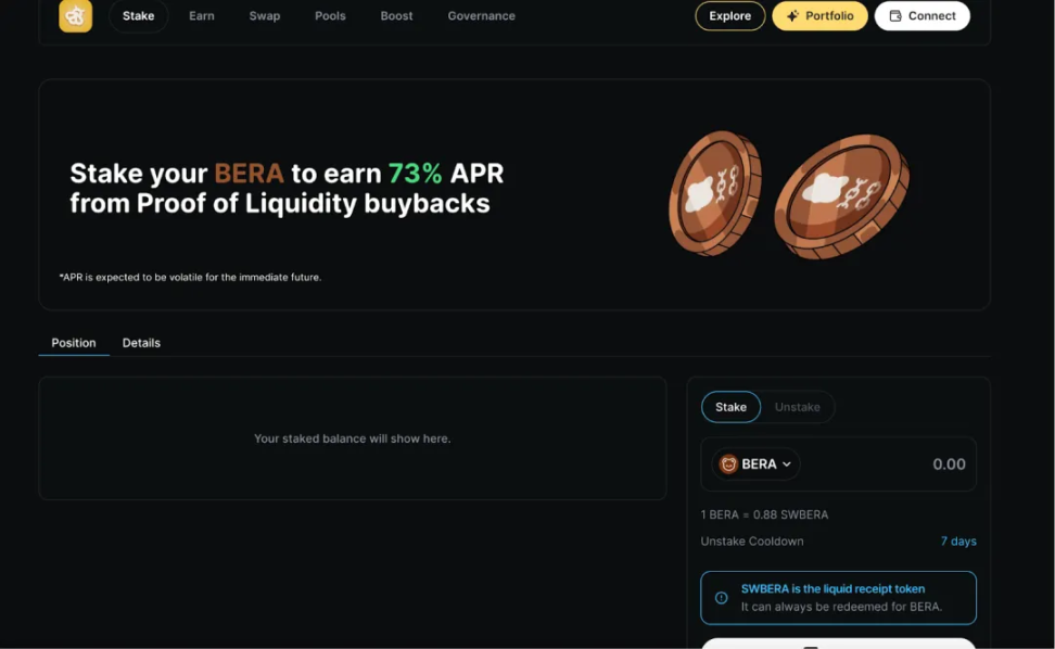 目前在 Berachain 的 PoL v2 ,其 BeraHub 支持 BERA 资产的原生质押,目前的收益率大约为 73%(自动复投),并且在完成质押后我们会获得质押凭证 sWBERA 资产。