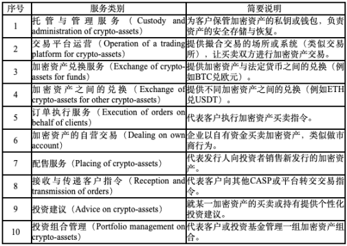 此外,MiCAR 共规定了 10 类服务活动,只要企业在欧盟境内从事这些活动之一,就必须取得 MiCAR 牌照,受监管约束。