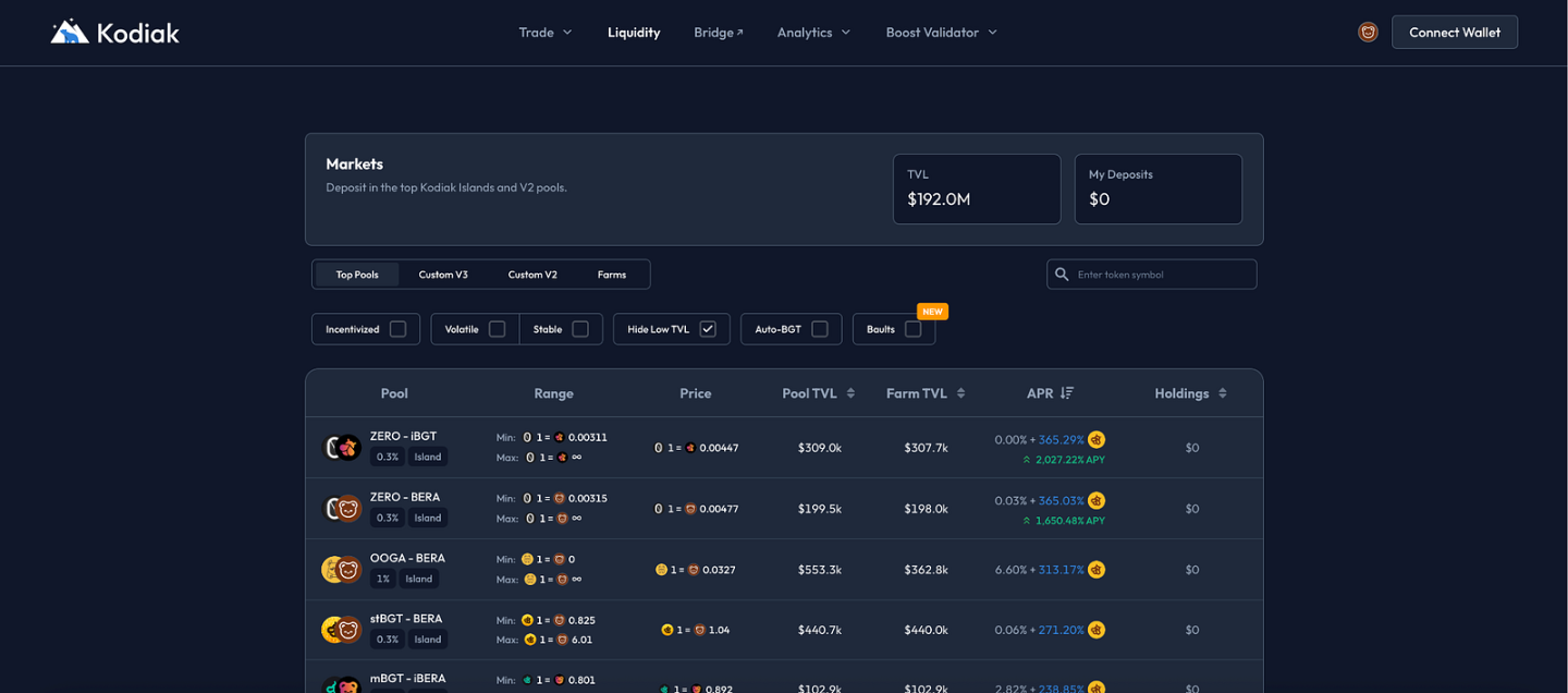 Kodiak Finance 是 Berachain 生态的核心 DEX 与原生流动性中心,专注于集中流动性、自动化管理和高效交易工具。协议采用垂直整合设计,使用户能够在同一平台完成代币发射、资产交易与流动性提供,支持的资产范围涵盖 BERA、HONEY、BGT 以及 RWA(如 rUSD)。Kodiak 与 Berachain 的 PoL 机制 深度结合,用户在提供流动性的同时即可获得 PoL 奖励,从而提升资金利用效率,并为生态整体带来更深的流动性与更优的交易深度。
