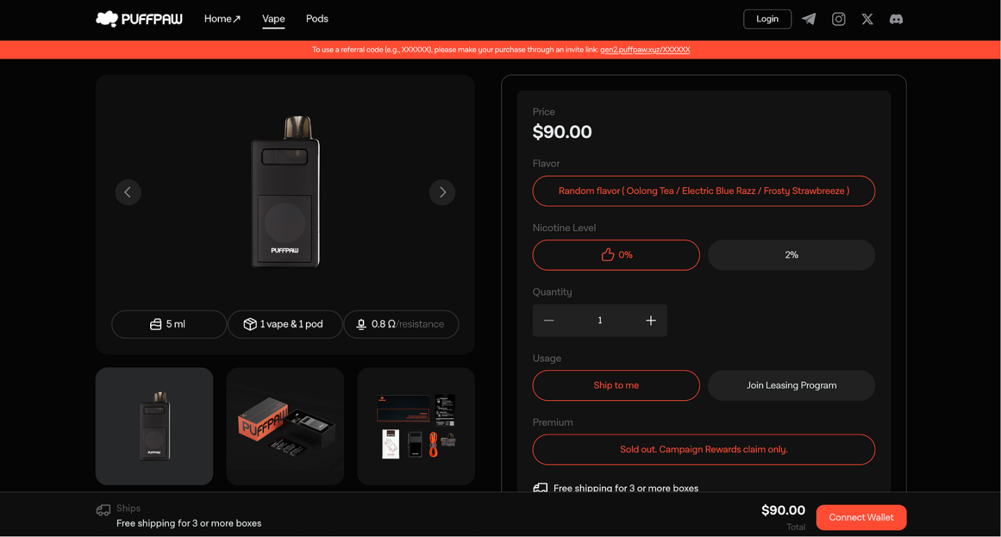 除了针对吸烟用户的戒烟激励,Puffpaw 还支持设备租赁功能,允许非吸烟者参与,获取租赁收益。协议已规划将模型扩展至 加热不燃烧(HNB/IQOS) 与 Cannabis 等其他消费品场景,逐步拓展硬件应用边界。与此同时,Puffpaw 也与 Kodiak Finance、Infrared Finance 等 dApp 协作,使奖励和流动性能够在生态中循环流转。