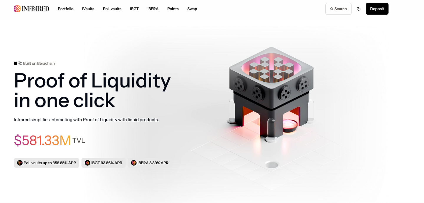 Infrared Finance 是 Berachain 生态中最核心的流动性质押协议,其目标是让用户更便捷地参与到 Berachain 的 PoL 共识机制中。通过 Infrared,用户可以将 BERA 或 BGT 直接质押到 PoL 奖励库,并获得衍生资产 iBERA 或 iBGT。这些代币不仅继承了原生资产的治理权和收益权,还能在 DeFi 协议中自由使用,相当于为资金增加了一层“流动性包装”。在该模式下,Infrared 实际上成为连接用户、验证者和应用协议的枢纽,显著提升了 Berachain 生态的资金效率。