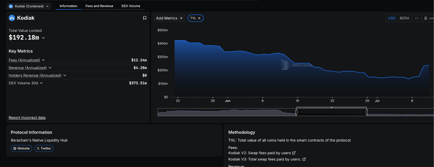 根据 DeFiLlama 截至 2025 年 8 月的数据,Kodiak 的 TVL 已达 1.92 亿美元,全部集中在 Berachain 链上,并一度推动生态总锁仓规模突破 32 亿美元。在费用与收益方面,协议年化费用约 1,224 万美元,累计费用超过 1,086 万美元;年化收入约 428 万美元,累计收入达到 375 万美元。交易活跃度同样表现突出,过去 30 天的 DEX 交易量达到 3.73 亿美元,累计交易量超过 43 亿美元。仅在 2025 年第二季度,Kodiak 的费用收入就高达 563 万美元,展现出稳健的增长势头。