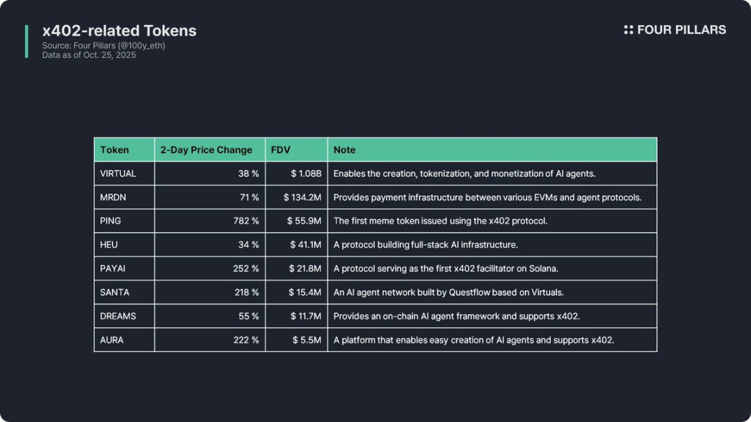 但 x402 与这些概念存在本质区别:其一,「AI 智能体支付」不仅在加密领域具有高相关性,在整个 AI 行业也具备实际价值,属于「潜力型」主题;其二,众多 Web2 企业正积极关注并采用 x402。这些因素意味着,x402 可能不会长期停留在炒作阶段,而是快速过渡到基础设施建设阶段。
