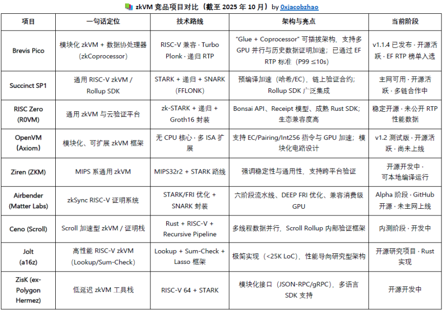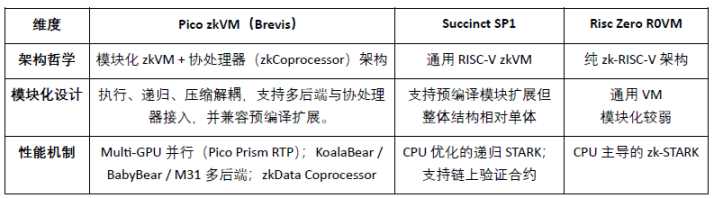 相较于 Succinct SP1 的相对单体化 RISC-V zkVM 架构和 RISC Zero R0VM 的通用 RISC-V 执行模型,Pico 通过 Modular zkVM + Coprocessor System 实现执行、递归与压缩阶段的解耦与扩展,支持多后端切换及协处理器集成,在性能与可扩展性上形成差异化优势。