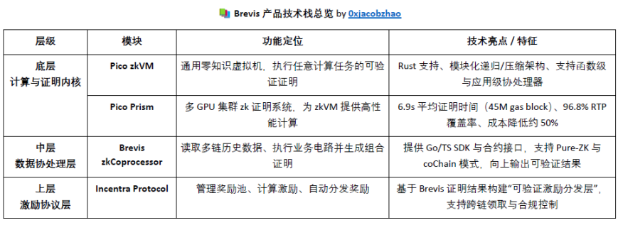 Brevis 以「通用 zkVM(Pico/Prism)」与「数据协处理器(zkCoprocessor)」构建多链可信计算层:前者解决任意计算可验证问题,后者实现历史与跨链数据的业务落地。