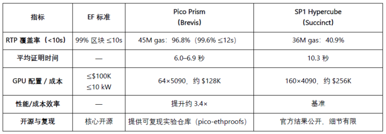在 64×RTX 5090 GPU(约 $128K) 配置下,Pico Prism 在 45M gas 区块中实现 平均延迟 6.9 秒、96.8% <10s、99.6% <12s 的性能表现,显著优于 Succinct SP1 Hypercube(36M gas,均时 10.3s,40.9% <10s)。在延迟降低 71%、硬件成本减半的条件下,整体性能 / 成本效率提升约 3.4×。该成果已获以太坊基金会、Vitalik Buterin 与 Justin Drake 的公开认可。