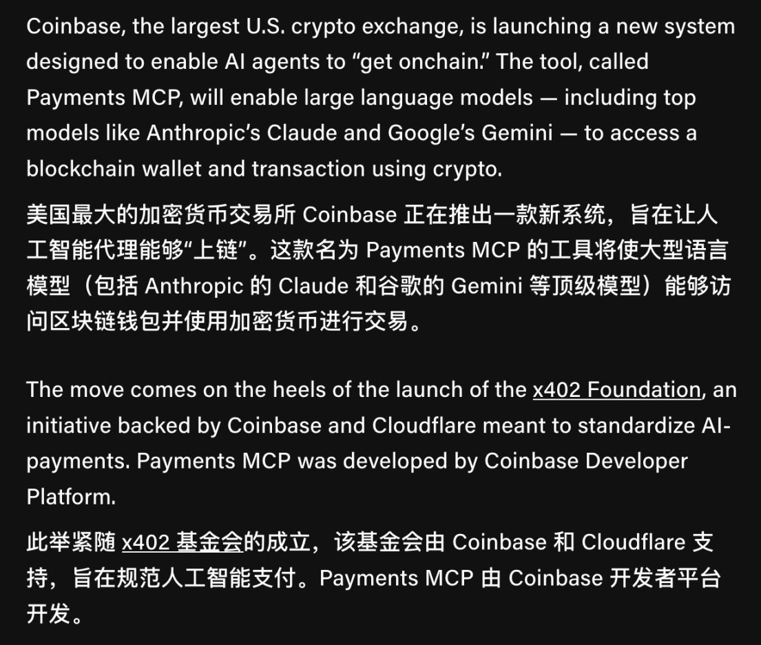 以美国最大的加密交易所 Coinbase 为例,即宣传 x402 基金会成立后,该机构本月宣布推出一款新系统,让 AI 代理也能“上链”。简单来说,这个工具可以让像 Claude 和 Gemini 这样的顶级 AI 大模型直接访问区块链钱包,并用加密货币完成交易。
