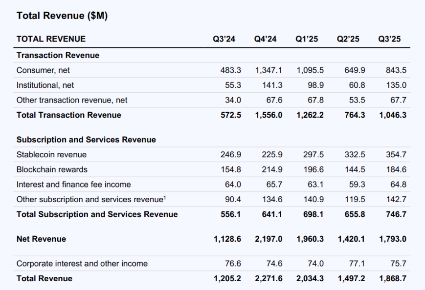 10 月最后一天,Coinbase 发布了 2025 年三季度财报,展现出强劲的经营韧性与增长潜力,不仅实现了营收、利润的双位数环比增长,也在「全品类交易所」(Everything Exchange)战略推进、稳定币和支付、衍生品业务突破、托管业务拓展等维度取得关键进展。