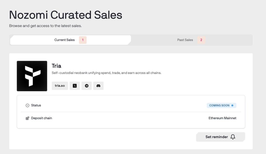 Tria 是一款非托管型新银行应用,支持用户在 100 多条链上实现消费、交易与收益获取,全程免 Gas 费、无需助记词。它将于 11 月 3 日在 Legion 的 Nozomi 开启 「基于贡献度发售轮」 。