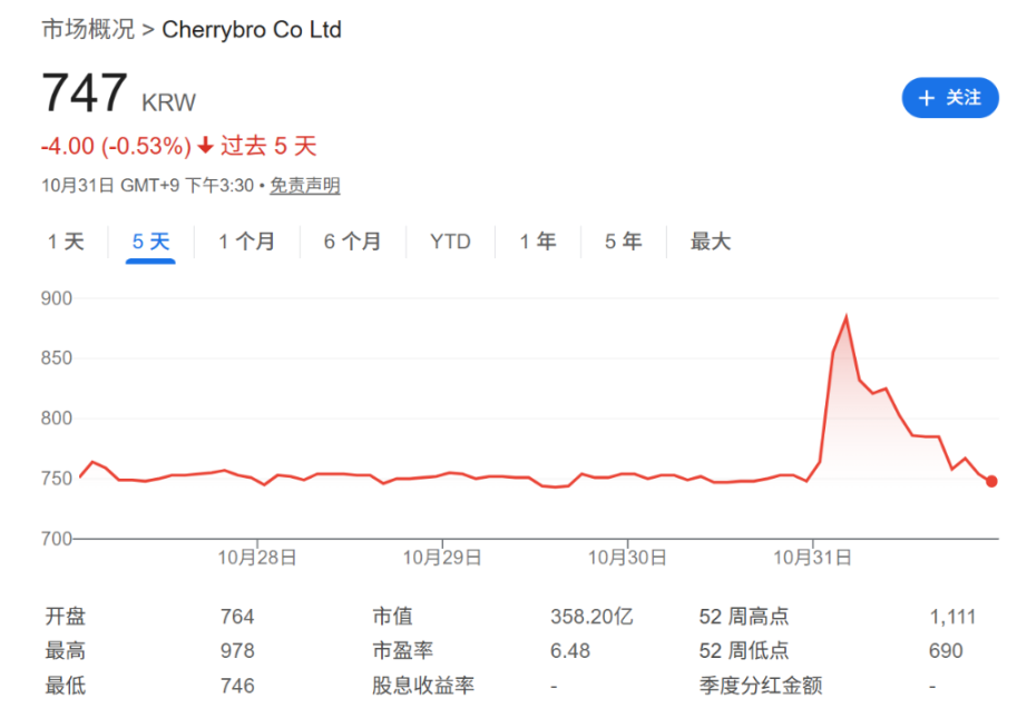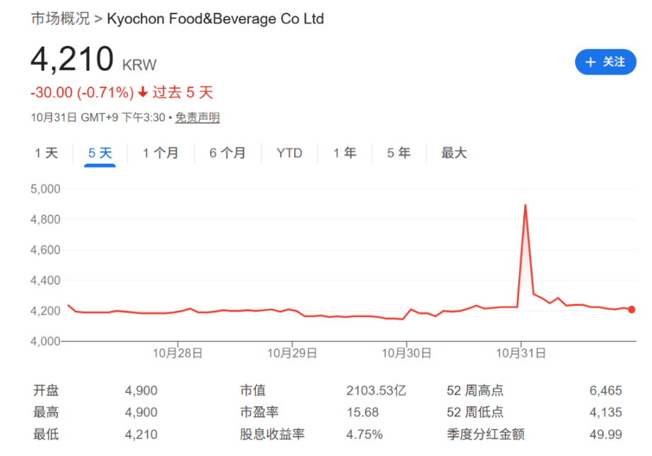由于聚会地点 Kkanbu Chicken 未上市,寻求短期收益的交易者将目光投向了其他相关公司。炸鸡连锁品牌 Kyochon F&B Co.的股价一度上涨 20%,而上游的家禽加工商 Cherrybro Co.股价更是直接冲高至 30% 的涨停。
