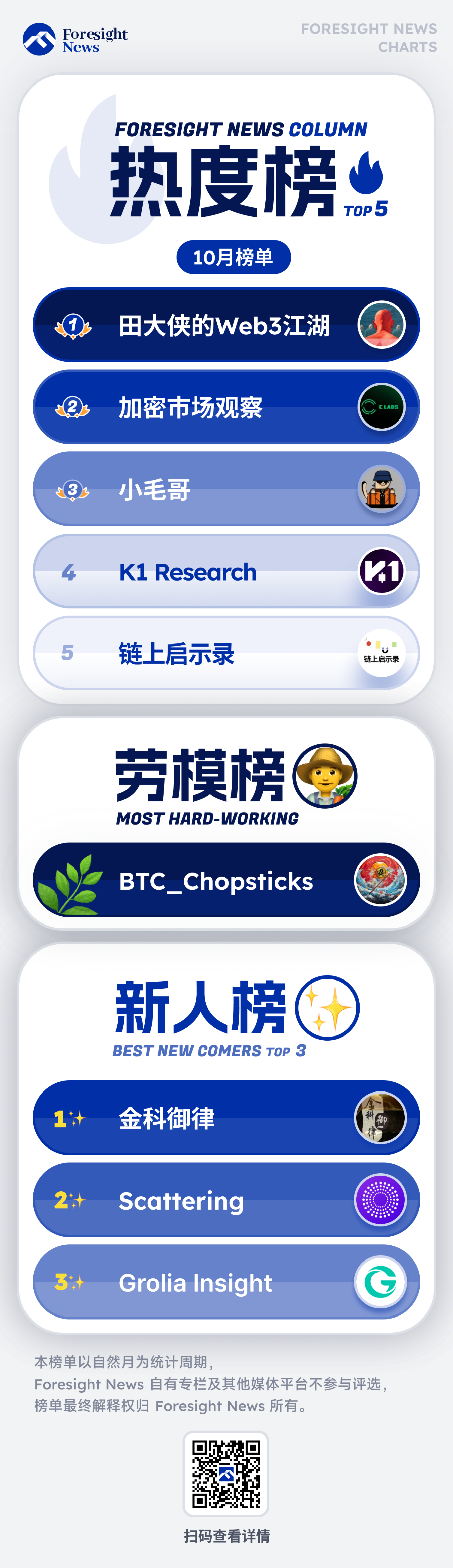 Foresight News 根据 2025 年 10 月份专栏作者文章阅读量、内容质量、发文数量等数据,综合评定出当月热度榜 Top5、劳模榜 Top1 及新人榜 Top3,并附上其专栏下优秀文章推荐: