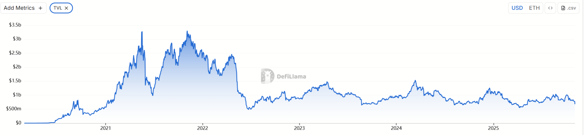 Balancer 成立于 2020 年,由 Balancer Labs 开发,是一个自动化做市商 (AMM) 协议,允许用户创建自定义流动性池,支持多种资产的权重调整。与 Uniswap 等简单 AMM 不同,Balancer 的设计更注重灵活性和资本效率,尤其在 V2 版本中引入了 “提升池” (Boosted Pools) 和金库 (Vault) 系统,这些功能旨在优化收益率并减少滑点。上轮 DeFi 热潮,Balancer 的 TVL 一度升至 32.39 亿美元。