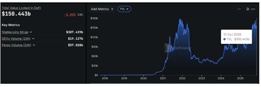 根据 DefiLlama 最新数据,全球 DeFi TVL 已突破 1500 亿美元,但增长率放缓至 15%,远低于 2020 年的爆炸式扩张。