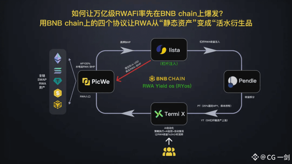 现在,我们将这些协议串联成一套“RWA Yield OS”,以 PicWe 的 RWA 资产为基础,通过 Lista DAO 进行杠杆放大,用 Pendle 对 RWA 资产进行 PT/YT 拆分,然后通过 TermiX 以自然语言驱动这套策略。目标是将 RWA 的稳健 APY(如水电站 RWA 的 20% APY),转化更高的复合收益,从而释放 RWA 资产的金融价值和可玩性,而且这套策略完全适用于 DeFi 从新手到专家不同阶段用户。