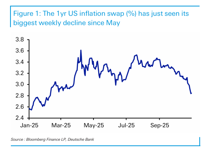 据追风交易台消息,德银在 11 月 3 日的报告中指出,受益于上周的贸易缓和,美国 1 年期通胀互换(inflation swap)录得自 5 月以来的最大单周跌幅。与此同时,作为传统通胀对冲工具的黄金价格也已从高点回落。