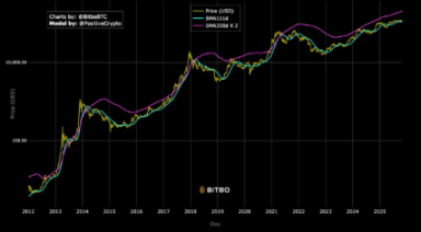当 111 日移动均线自下而上穿越 350 日均线时,