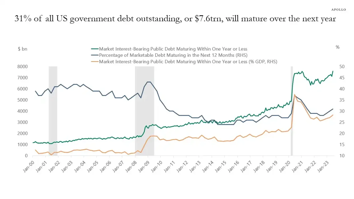 31% 的美国政府债务(约 7 万亿美元)将在未来一年内到期,加上新增债务发行,总规模可能达到 10 万亿美元|图源:Apollo Academy