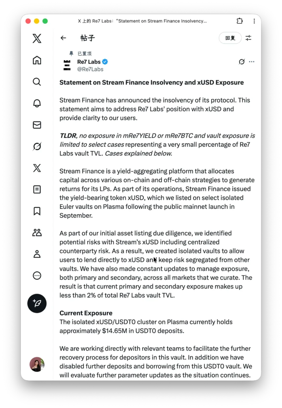 事实上,协议之间直接勾兑早已不是新闻,Ethena 引入 CEX 资本的同时,便具备 ADL 清算时的部分豁免权,回到 xUSD,在众多金库主理人的回应里,Re7 最有意思,「我们识别到了风险,但是在用户强烈请求下,我们还是上架了」。