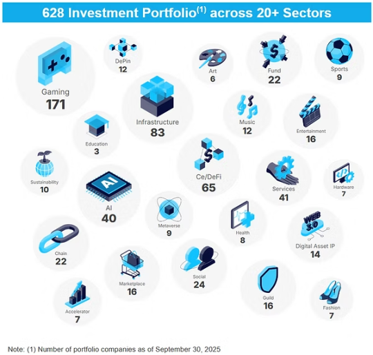最上层仍然是大家熟悉的内容与流量:链游、NFT、IP 合作等,构成面向用户的前台。The Sandbox 依然是象征性入口。中层是投资与资产网络。Animoca Brands 多年累积的股权和代币仓位,已覆盖交易所、基础设施、公链、DeFi 协议、内容平台等多个赛道的 600 余项目。它的资产负债表就像是 Web3 的行业地图。