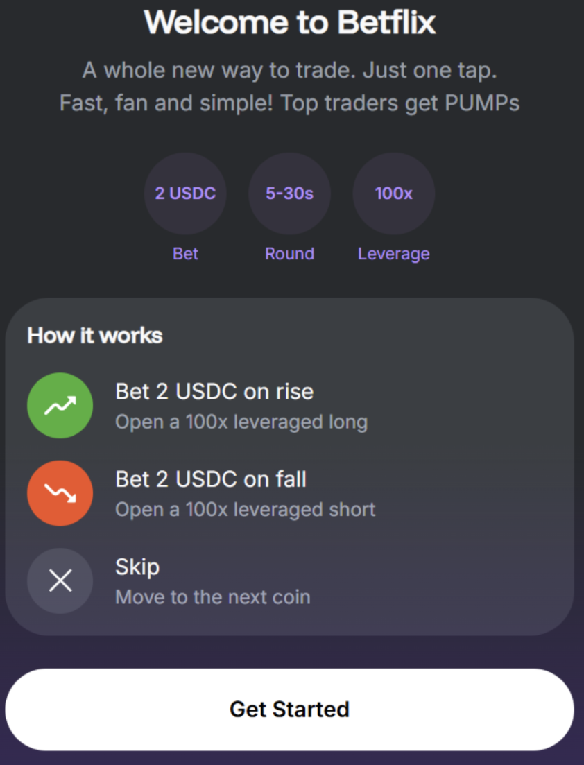 BetFlix 的核心是滑动操作机制,类似 Tinder 的匹配界面,用户只需左右滑动即可完成对代币价格方向的预测——左滑看空,右滑看多。