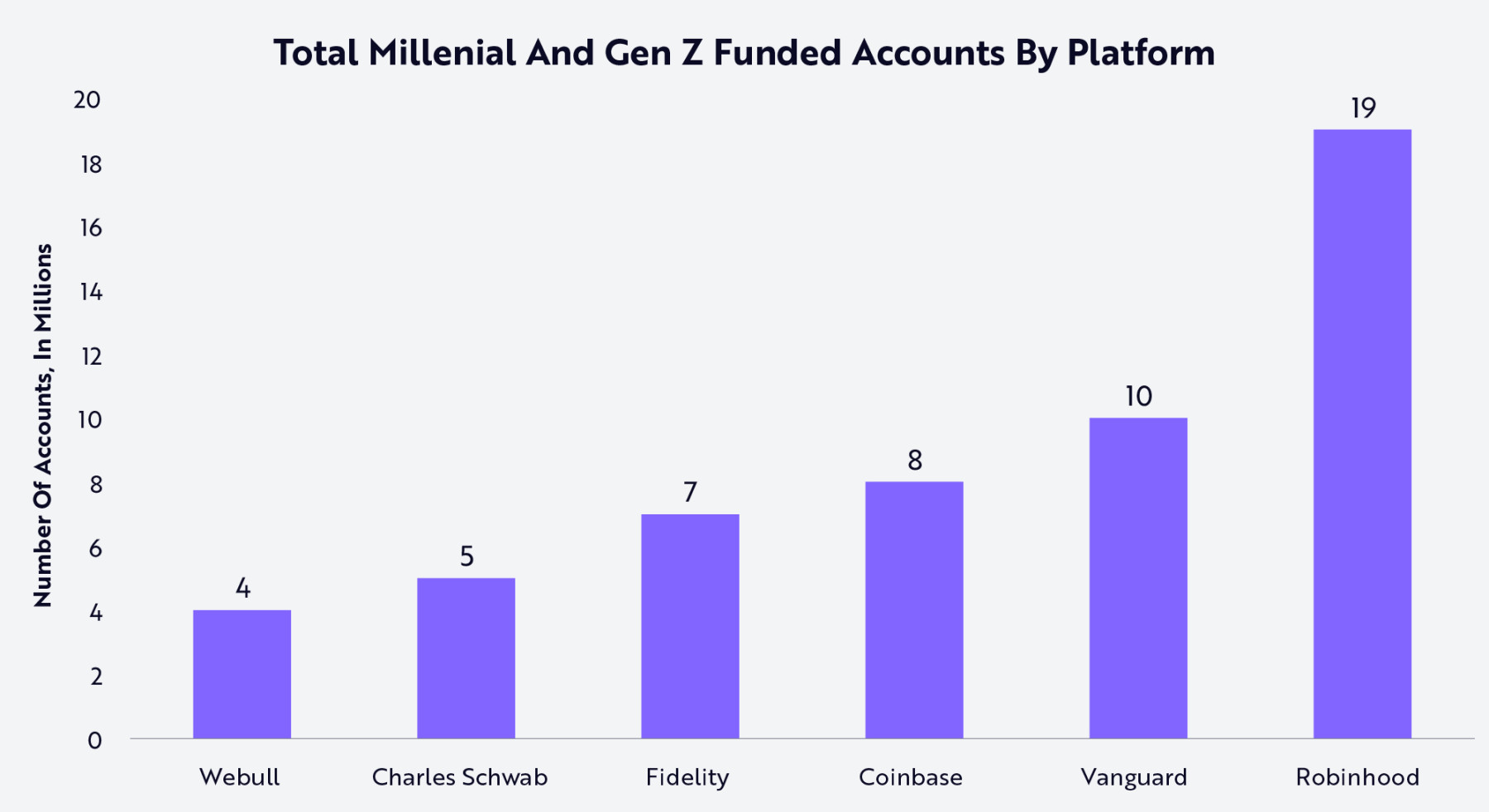 伴随这场财富转移而来的文化变革,也标志着人们对金融服务运作方式的期望发生了转变。婴儿潮一代是在一个依赖线下网点、纸质账单和长期顾问关系的模拟世界中构建其财务生活的。而千禧一代和 Z 世代则更青睐于在直观的移动原生平台上,享受数字化优先的沟通、商业和娱乐体验,以及无缝、透明且个性化的金融服务。我们的研究表明,Robinhood 凭借其快速的产品迭代和创新能力,能够赢得千禧一代和 Z 世代投资者的青睐,相比那些试图通过现代化产品体系来竞争的新进入者和传统机构,它能更快地抢占市场份额。