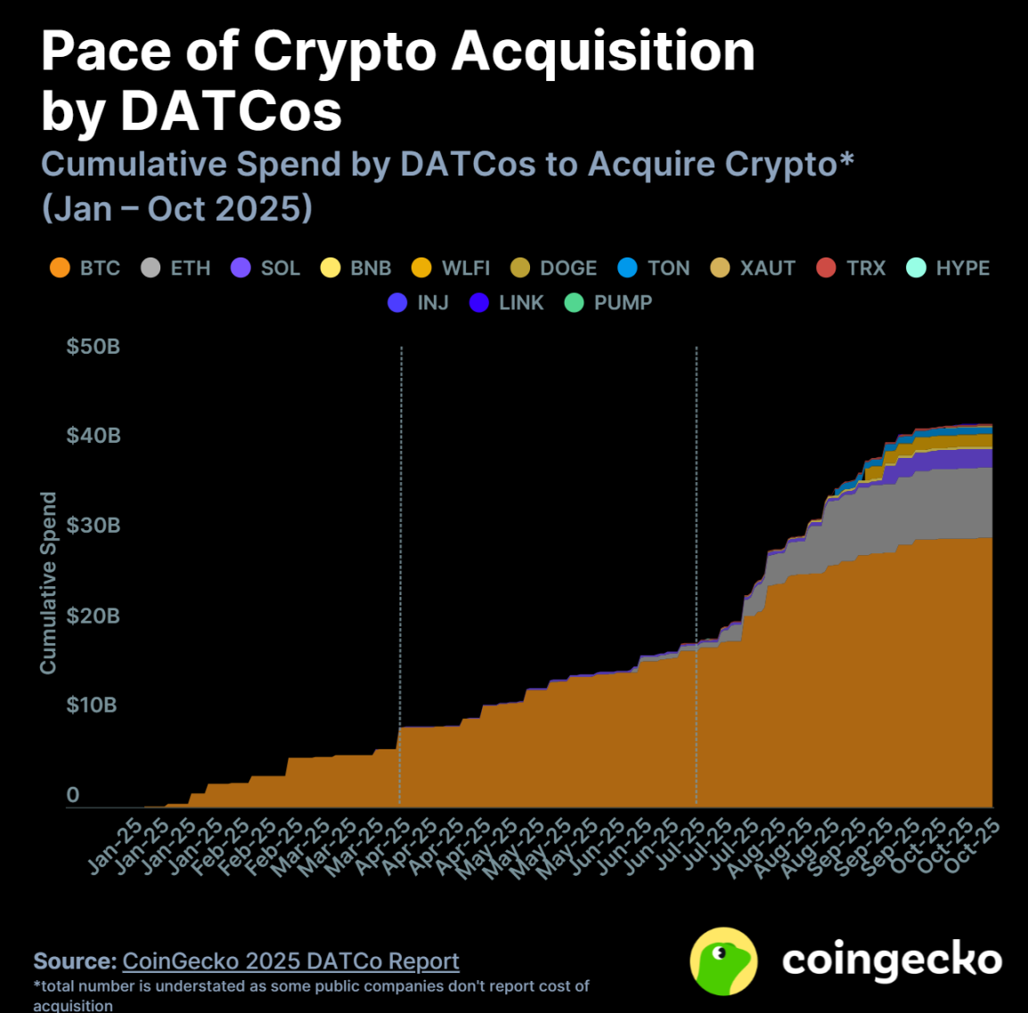 比特币 DATCo 是最大的买家,自 2025 年初以来累计购买了至少 300 亿美元的 BTC,占所有 DATCo 加密资产购买总额的 70.3%。