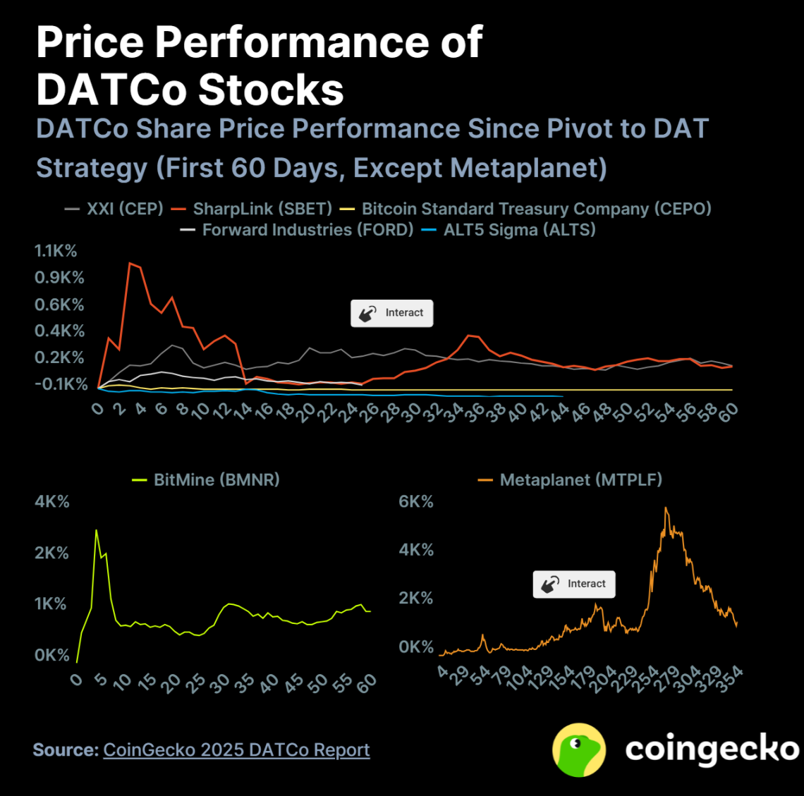 目前唯一的例外是 Metaplanet,其股价在前 10 天内上涨约 100%,但之后用了 269 天才达到约 6,200% 的峰值回报。