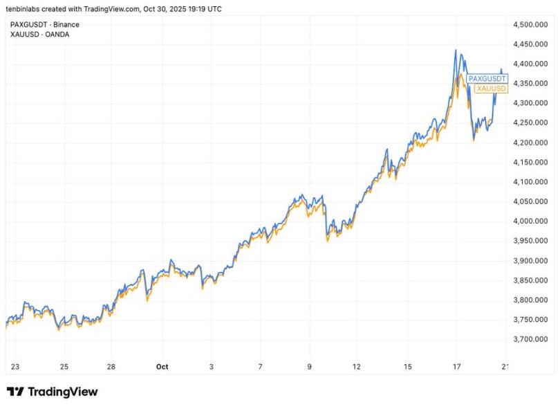 这些摩擦让做市商望而却步,除非利润足够丰厚。结果就是代币化黄金的价格可以大幅偏离真实价值,甚至突破费用设定的边界。