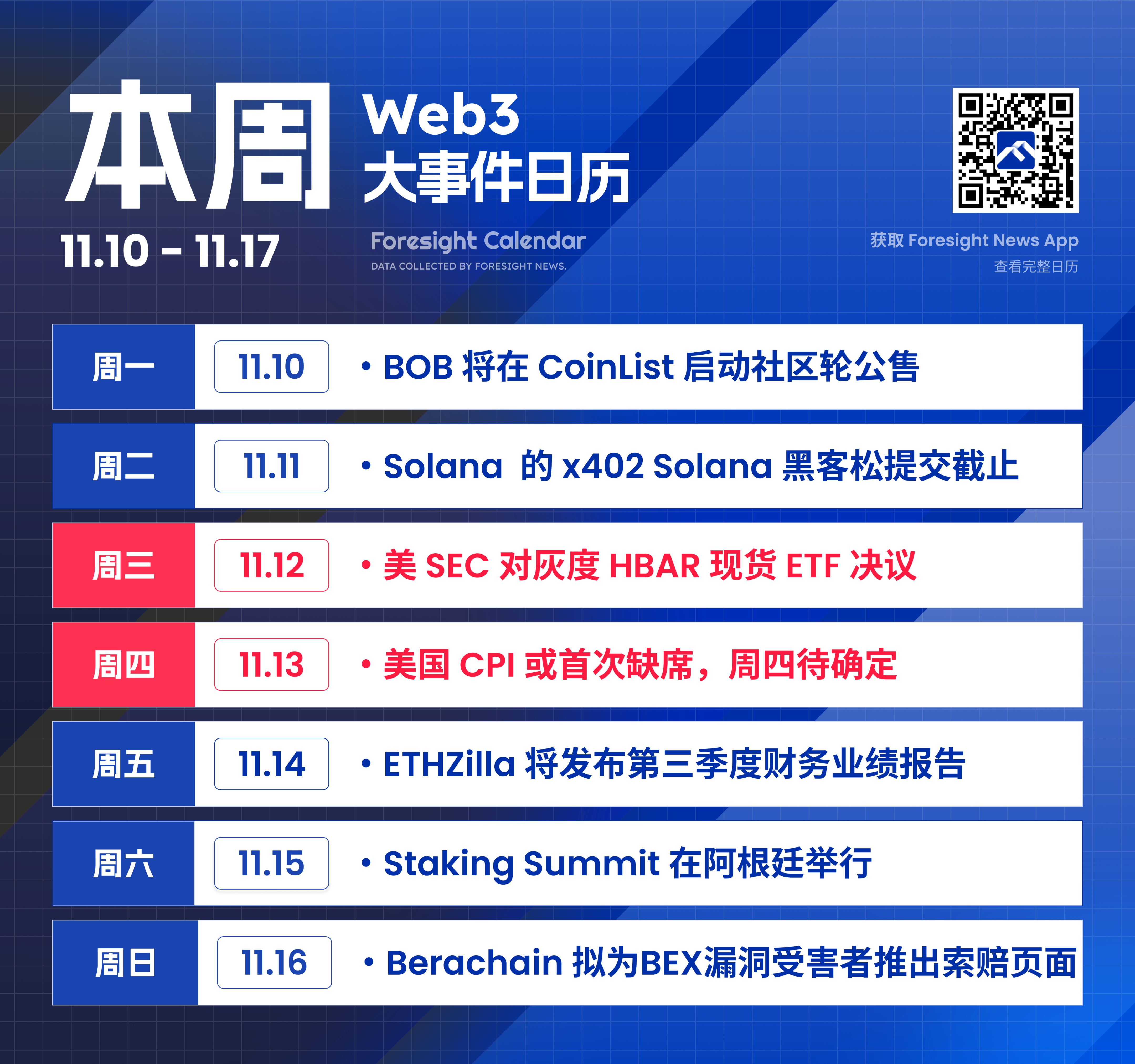 本周(2025 年 11 月 10 日 - 11 月 16 日)Web3 大事件不容错过,下图是本周精彩预告: