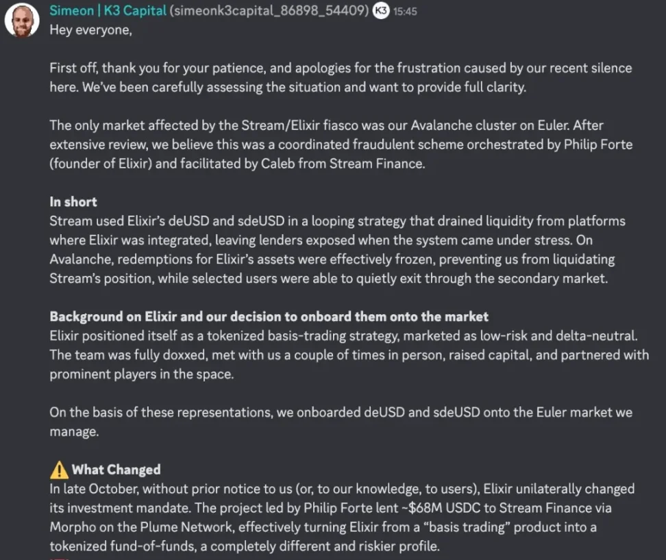 当 Stream 的坏账在 11 月 3 日公开后,K3 立刻联系 Elixir 的创始人 Philip Forte,要求保障能够 1:1 清算 deUSD。但 Philip 选择了沉默,完全不回应。在无奈之下,K3 只能在 11 月 4 日强行清算,手上留下了 200 万美元的 deUSD。Elixir 在 11 月 6 日宣布资不抵债,它的解决方案是散户和流动性池里的 deUSD 可以 1:1 兑换成 USDC,但 Curator 金库里的 deUSD 不给兑换,要求大家一起协商解决。