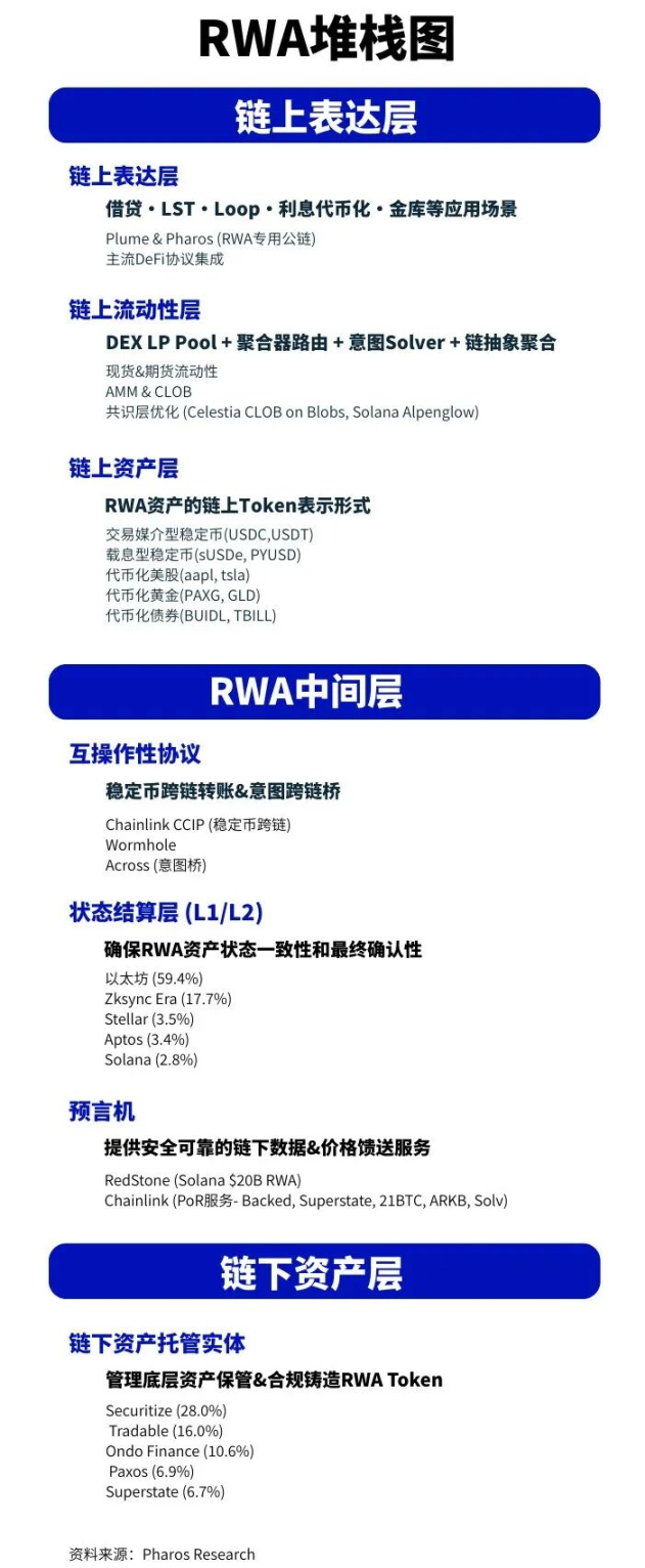 RWA 中间层堆栈由链下托管实体、状态结算层、预言机、应用层、互操作协议、链上流动性层等构成。