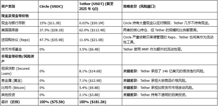 Circle 及 Tether 储备资产构成对比(数据截至 2025 年第三 / 四季度)