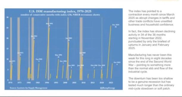 制造业 PMI 指数已连续萎缩超过 18 个月,是二战以来最长纪录,但股市却持续上涨,因为利润越来越集中在科技巨头和金融公司。(注:「制造业 PMI 指数」的全称是「制造业采购经理人指数」, 是衡量制造业健康状况的「晴雨表」。)