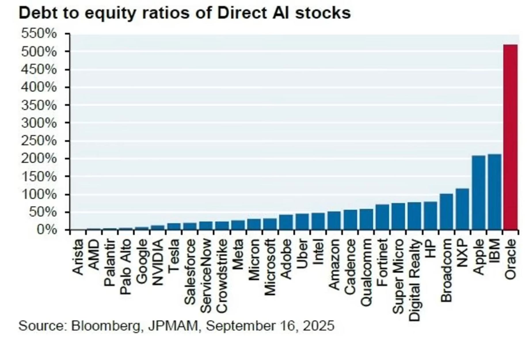 科技界的老牌巨头 Oracle(甲骨文)正在进行一场高风险的豪赌。为了在 AI 数据中心领域挑战 Amazon(亚马逊)、Microsoft(微软)和 Google(谷歌)的霸主地位,它正以极高的债务为代价,投入数千亿美元进行扩张,包括与 OpenAI 合作的「Stargate」超级数据中心计划。其债务股本比已达到惊人的 500%,意味着其总债务规模是净资产的五倍。相较之下,Amazon 的债务股本比仅为 50%,Microsoft 的数据甚至更低。简单来说,Oracle 几乎押上了公司的全部身家乃至未来的价值,在这场 AI 竞赛中进行一场豪赌。